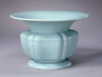 尊廣口外撇,折肩,腹部呈六方委角形,束腰,圈足外撇。通體滿施青釉,只在肩部飾一道凸起的弦紋。外底青花書“大清雍正年制”六字篆書款。