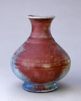 瓶撇口,短頸,溜肩,鼓腹,圈足外撇。頸、腹部各飾三道凸弦紋。通體施窯變釉。足內(nèi)施醬釉,陰刻“雍正年制”雙行四字篆書款。