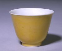 盅敞口,直斜壁,圈足。盅內(nèi)施白釉,外施黃釉,釉色純正,釉面光亮瑩潤(rùn)。足底青花雙圈內(nèi)書“大清雍正年制”雙行六字楷書款。