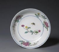 粉彩瓷器初創(chuàng)于康熙晚期,是在五彩的基礎(chǔ)上受琺瑯彩瓷器的影響而創(chuàng)燒出的一種新型彩瓷。康熙粉彩瓷器處于初創(chuàng)階段,造型有盤、水丞等。此盤用平涂法繪畫,畫筆簡(jiǎn)練,施彩較厚,色階不夠豐富,顯示出粉彩瓷器初創(chuàng)階段的特點(diǎn)。此種盤也見署楷體“大明成化年制”仿款者。
