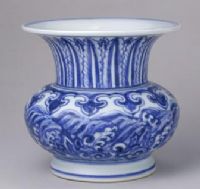 尊廣口,扁圓腹,圈足。通體繪青花紋飾,頸部繪蕉葉紋,腹部繪海水波濤,海水上為如意云頭紋。足底青花雙圈內(nèi)有青花楷書“大明宣德年制”六字款。