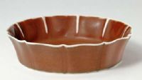 洗通體作十瓣菱花式,敞口,淺身,腹壁近直,平底。通體施鮮紅釉,釉面勻凈,色鮮艷?谘嘏c腹壁花瓣出筋處顯露潔白的胎色,與器身的紅釉相映生輝。底施白釉,無款。