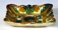 盤四方花口,口微敞,平底。盤內(nèi)四面立壁均分飾2開光,每開光內(nèi)飾花卉1朵,花卉兩側(cè)對稱飾卷云紋。盤內(nèi)底四角飾葉紋,底心模印團菊1朵。盤內(nèi)施黃、綠、白三色釉彩,盤外施半釉。