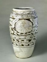 缸唇口,溜肩,深腹,圈足。外壁通體以剔花裝飾。其做法是先在灰褐色胎上施一層潔白的化妝土,劃出花葉、纏枝牡丹、回紋等紋樣,再將花紋以外的地子上的白色化妝土剔掉,露出灰褐色胎,形成深色地子襯托白色花紋的裝飾效果。