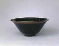 此盞口徑較大,線條流暢,造型十分優(yōu)美。雖然它的胎、釉、造型都與建陽窯黑釉盞明顯不同,例如,前者胎為白色,而后者為紫黑色胎,但它仍屬于建陽窯類型器物。宋代黑釉茶盞以福建建陽窯燒制的產(chǎn)品最為著名,燒造量也很大,其他地區(qū)如四川、山西、江西、河北、河南等地也有燒制。