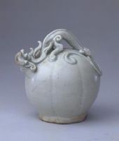 壺為瓜棱球形,一條堆塑其上的螭龍巧妙地形成壺流與提梁,平底,底中心有一注酒的圓洞。通體施青白釉,釉色白中泛青,瑩碧剔透。此壺造型新穎別致,清新怡人。