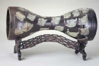 腰鼓廣口,纖腰,鼓身凸起弦紋七道。通體以花釉為飾,在漆黑勻凈的釉面上,潑灑出塊塊藍白色斑點,宛如黑色閃緞上的彩飾,優(yōu)美典雅。
