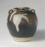此罐口部外撇,短頸,圓腹,平底。肩部對稱置半環(huán)形系。罐身施黑褐釉至近足部,上飾月白色斑塊。此為唐代著名的花瓷罐。