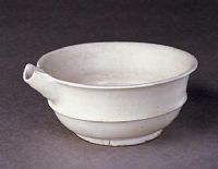 匜撇口,折腰,腹部凸起弦紋一道,平底?谶呉粋(cè)出槽形短流。胎體潔白。里外均施透明釉,釉層顯現(xiàn)細(xì)碎開(kāi)片。弦紋碗、弦紋匜是河南鞏義窯常見(jiàn)的器形,造型仿唐代金銀器,除白釉外,還有藍(lán)釉品種。