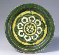 盤口為板沿式,平底,下承3足。通體以綠釉為地,盤心刻一團花,外環(huán)荷花、花蕾及荷葉紋,施以黃、綠、白三色。底無釉。