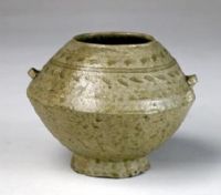 罐斂口,折腹,束腰,平底,腹兩側(cè)各有一橫系。罐身施青黃釉。肩飾水波紋及弦紋。此罐的造型如同魚簍,小口,大腹,以增其容積。這是西周早期原始瓷的造型特征。