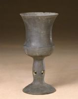 杯敞口,束腰,高柄足外撇,平底。杯身有凸出的弦紋為飾,高柄中空,柄外壁鏤三孔。因采用了輪制方法,器壁較薄,素面磨光,配以鏤空等多種工藝手法,制作十分考究,是一件精致的飲酒用具。