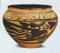 大口,豐肩,平底內(nèi)凹。內(nèi)部施黑釉,外部在白釉上繪黑花。肩部飾蓮花、荷葉,腹上繪飛鳳紋。紋飾古樸,線條粗獷,具有濃郁的民間色彩。造型穩(wěn)重,當屬磁州窯風(fēng)格的產(chǎn)品。