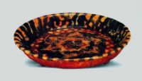 唐三彩是一種低溫釉陶器,釉色有黃、綠、褐、藍、黑、白、紫等。其中以黃、綠、褐彩為主,所以稱三彩。此盤外為黃色釉,內為黃、褐、綠三色釉,配以模印六角形圖案。色彩斑駁.鮮艷奪目,為三彩中之精品。