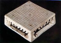 盤呈正方形,其上縱橫各刻19道直線,共計361個交叉點,中央和四角分別刻出天元和角星。盤面及四側(cè)施白釉。這是目前所見時代最早的19道圍棋盤。