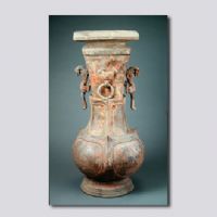 首都博物館藏。泥質(zhì)灰陶。仿青銅禮器造型,方形口,細(xì)長(zhǎng)頸,頸部四面有對(duì)稱鋪首銜環(huán)和虎形耳。球形腹,圈足。方形子口蓋,蓋紐內(nèi)凹。器身滿繪朱彩流云紋。陶壺是仿青銅禮器而制作的陶制禮器,戰(zhàn)國(guó)時(shí)期墓葬中常見(jiàn)鼎、簋、匜、壺禮器組合。彩繪陶始于新石器時(shí)代晚期,以紅、黑、黃、白、赭等彩在陶胎上繪畫(huà),戰(zhàn)國(guó)、秦漢時(shí)期是彩繪陶發(fā)展的繁榮時(shí)期,常常在壺、鼎、豆、匜、簋等器上通體彩繪,主要紋飾有流云紋、蟠螭紋、鋸齒紋、雙線三角紋等,此外,還經(jīng)常在陶俑上進(jìn)行彩繪,到唐代,彩繪陶走向衰落。