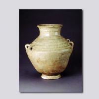 首都博物館藏。敞口,短粗頸,斜肩,折腹,圈足,足內(nèi)無釉。肩部貼有對稱雙系,并飾五組刻花弦紋。通體施青釉,釉色淡青,釉面不均勻,胎質(zhì)堅硬,呈淺灰色。它作為瓷器,尚不夠成熟,故稱之為原始青瓷。