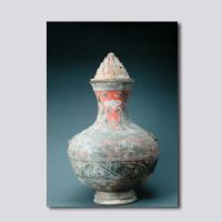 首都博物館藏。泥質(zhì)灰陶。盤口,長(zhǎng)頸,扁圓腹,臺(tái)階式圈足,博山式蓋,肩部有對(duì)稱鋪首。頸部及腹部以紅、白、藍(lán)、黑彩繪,腹部有三道弦紋將圖案分成三組。