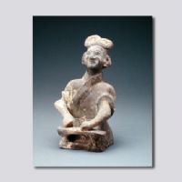 首都博物館藏。明器。通體施低溫綠釉。頭戴圓帽,身穿斜領(lǐng)短衫,兩袖高挽,屈膝而坐,身前放一短俎,持刀切肉。神態(tài)惟妙惟肖。