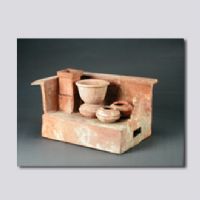 首都博物館藏。泥質(zhì)紅陶。明器。灶間為長方形,前端有長方形火門,上有火擋。灶面上有三個火眼,火眼上置釜,后端有方形煙囪。灶后和一側(cè)設(shè)圍屏。西漢中期以后的大墓中,隨葬明器陶灶之風(fēng)盛行,西漢時灶上有一個火眼,東漢時火眼增加到三至四個,并且在灶面上模印或刻劃出各種廚具與食品。