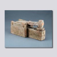 首都博物館藏。明器。施低溫綠釉,底座后端(即人操作處)的四角,各有一向上的支柱殘痕,推測支柱上面還應有一扶手。碓為稻谷脫殼工具,大約發(fā)明于西漢,使用時踏碓人用足踏下杠桿將碓舉起來,利用重力作用為稻谷脫殼。