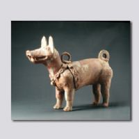 首都博物館藏。泥質(zhì)紅陶。明器。立姿。口部微張,雙目前視,雙耳聳立,頸與胸之間有系帶,并連接著鏈環(huán),尾巴上卷,四肢直立有力,肌體壯碩,栩栩如生。
