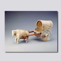 首都博物館藏。泥質(zhì)紅陶。明器。車為雙轅(已失),輿箱呈矩形,前面敞開,后面右側(cè)設(shè)一門,左右兩面全封閉,上連卷棚式車蓋,前后檐均較短,尤其是前檐較短是早期牛車的特征。輿箱底部有4個(gè)小孔用以固定車軸。車輪為模制,片狀,外側(cè)用雙線刻輻條。每輪輻條共16根,集中于粗圓的車轂上。車轂碩大也是當(dāng)時(shí)車輛的特征之一:古代車軸與車身相固定,行車時(shí)輪與轂轉(zhuǎn)動(dòng),轂上承車廂,下納輻條,還要耐得與車軸摩擦,故而體積較大。牛佇立于車前,作駕車狀,埋首引頸,肩峰高起,體態(tài)雄健,有將欲發(fā)車之勢(shì),十分形象生動(dòng)。此牛車塑造寫實(shí),比例中規(guī)。牛車模型明器多見于南北朝時(shí)期的墓葬中。