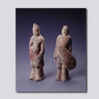 首都博物館藏。左:高23厘米。泥質(zhì)灰陶。上有白陶衣,有紅彩。明器。頭戴武冠,斂下頜,上身內(nèi)穿緊身寬袖衫(褶衣),外披裲襠鎧,鎧上有魚鱗形甲片、上施朱紅色彩。鎧甲內(nèi)襯厚實的裲襠衫。腰束帶。下著褲管寬松博大的縛褲。身背箭壺,內(nèi)盛數(shù)枝長箭。裲襠鎧是南北朝時將士的主要裝備,士兵與軍官皆用。因其曾經(jīng)被指定為武官甲制,結(jié)合起所戴之冠分析,此俑表現(xiàn)的應(yīng)是一軍官形象。右:高21.5厘米。泥質(zhì)灰陶。上有白陶衣,陶衣上原有紅彩已脫落。明器。站姿。頭戴小冠,挺胸昂首,上身內(nèi)穿圓領(lǐng)折襟左衽及膝褶衣,外著對襟窄袖套衣,腰束帶,下著縛褲,雙手垂于體側(cè),右手執(zhí)物已失,左手持盾。盾為圭形,四周有凸起的邊廓,中間有一條縱向凸棱,起加固作用。