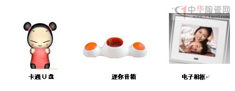 各種色彩豐富、小巧別致的電子產品也得到市場的青睞,手機、MP4、禮品U盤、筆記本、吹風機等商品被當成禮品贈送?ㄍㄔ煨偷腢盤、閃亮的數(shù)碼相框、迷你音響等產品精彩紛呈,以更豐富的功能、充滿藝術情趣的外觀設計扮美家居生活。