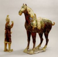 說(shuō) 明: 馬俑施棕紅、綠、白三彩釉,是一匹駿馬形象.俑人施棕紅、白彩釉。