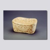 首都博物館藏。元寶形,枕面中心以珍珠紋為地,刻“齊壽”二字,四周刻卷草紋邊飾,“齊”字下腳空隙處,巧飾葉紋壓肩。枕四壁以珍珠紋為地,刻纏枝菊花,底刻“大吉”字樣。花紋凹處刻劃較深,經(jīng)燒造后呈褐色。珍珠地紋飾,源于唐代金銀器上的鏨花裝飾,河南密縣窯在唐代首先應(yīng)用于瓷器裝飾。其工藝是用管狀竹木或金屬工具,在施好化妝土的坯體上戳印而成,圓點周圍露出胎體本色,中心是白色,再施以透明釉。經(jīng)高溫?zé)旌螅纬缮{(diào)對比強烈的藝術(shù)效果。
