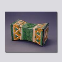 首都博物館藏。泥質(zhì)紅陶,有化妝土。長方形,束腰。以黃、綠、白三彩裝飾,每面中心部位都有行書題詩一首,兩側(cè)為邊飾。在瓷器上題寫通俗詩句和民諺作裝飾是磁州窯的一大特點,它反應(yīng)了商人、小市民的思想意識。