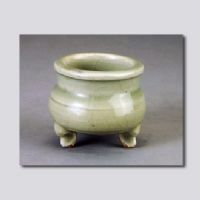 首都博物館藏。折沿,直口,束頸,鼓腹,平底,下承以三獸足。通體施青釉,釉面光潔瑩潤(rùn)有大開(kāi)片,造型小巧別致。