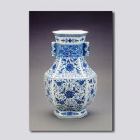 首都博物館藏。六方形,撇口,直頸內(nèi)弧,折肩,鼓腹,圈足。頸部有對稱的管狀貫耳,因而得名?谘叵吕L一周回紋,回紋下及圈足上繪折枝花卉。頸部繪海水紋,腹部每個棱面繪折枝番蓮紋。底足內(nèi)書青花“大清乾隆年制”6字3行篆書款。胎體厚重堅實,瓷質(zhì)精細(xì),釉色白潤勻凈,青花呈色穩(wěn)定艷麗。