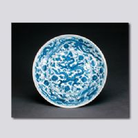 首都博物館藏。撇口,弧腹,圈足。盤內(nèi)及外壁均繪穿花龍紋,外底書青花“大明正德年制”6字雙行楷書款。青花色調(diào)藍(lán)中泛灰,暈而不散,代表了這一時(shí)期的藝術(shù)風(fēng)格。穿花龍紋是正德時(shí)期常用的紋飾之一。