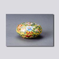 首都博物館藏。子母口,臥足?谘丶暗走呰偨穑袃(nèi)施豆綠色釉,盒外壁在黃地上以紅、綠、白、藍(lán)、杏黃諸色繪番蓮紋,底書青花“大清乾隆年制”6字3行篆書款。花葉紋飾花葉自然翻卷,色彩濃淡相宜。