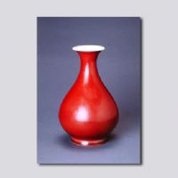首都博物館藏。撇口,束頸,垂腹,圈足。通體施霽紅釉,呈暗紅,釉面布滿大小不等的氣孔。底書青花雙圈“大清雍正年制”6字雙行楷書款。器型較前代厚重飽滿。具有典型的時(shí)代風(fēng)格。