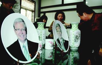 昨天上午十時(shí),印有澳大利亞總理陸克文頭像的直徑40厘米掛盤(pán)以及5個(gè)山水四方瓶和5套梅花六頭文具在醴陵市瓷藝堂成功出窯。這批瓷器將在國(guó)家政治局常委李長(zhǎng)春出訪澳大利亞時(shí)當(dāng)做國(guó)禮送給澳總理陸克文以及其他官員。