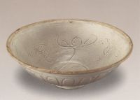 說(shuō) 明: 內(nèi)外均施青白釉,口沿?zé)o釉。劃花紋飾線條簡(jiǎn)練流暢。