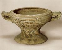 說 明: 泥質灰陶。器表各部用紅彩繪制出云雷紋與曲折紋等圖案裝飾。