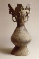 說 明: 泥質灰陶。方形口,細長徑。造型別致,裝飾華麗。