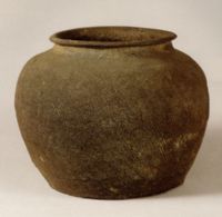 說 明: 印紋硬陶。器表滿飾拍印的小方格紋。胎質(zhì)堅(jiān)硬,呈灰褐色。
