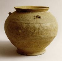 說 明: 原始青瓷。通體滿施三周小方格紋寬帶條。