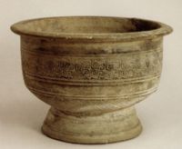 說 明: 泥質(zhì)灰陶。直口,沿外折、圓唇、深腹略鼓、圓底、高圈足。