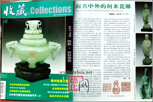 何朝宗除雕塑觀音形象外,還塑過達(dá)摩、菩提等佛像,皆別具一格。他創(chuàng)作的一尊達(dá)摩立像,通高43.1厘米。達(dá)摩立于波濤洶涌之間,禿頭長耳,雙屑微鎖,流露出緘默沉思的表情;袒胸披肩,帔紋翩然欲動(dòng);長裙飄拂,宛如乘風(fēng)破浪疾馳而行,恰切地表現(xiàn)了這位少林初祖堅(jiān)忍不拔的精神。文昌帝君坐像身著寬袖長袍,正襟危坐;左手執(zhí)玉如意,右手自然下垂,兩足蹬靴微露;上胸袍領(lǐng)外翻內(nèi)露交角襯衫;腹部上下束帶中間顯示雍容大肚。袖臂衣身下擺各隨手足之勢,或彎曲轉(zhuǎn)折,成突起拖拽,或深陷掩映,極富層次變化。這座塑像修短合度,立體感強(qiáng),可以看出何朝宗出神入化的功力和嚴(yán)謹(jǐn)認(rèn)真的創(chuàng)作態(tài)度。何朝宗的瓷雕作品瓷土和釉料都與當(dāng)時(shí)一般的德化白瓷不同,因瓷雕胎體厚重,燒制時(shí)采取了一些特別的加工工藝。據(jù)當(dāng)?shù)乩纤嚾私榻B,何氏作品的瓷土取自德化城關(guān)附近的觀音崎,經(jīng)多次淘洗煉制,還要經(jīng)過很長一段時(shí)間的陳腐之后,才能應(yīng)用。何氏瓷雕釉與坯體渾然一體,釉色白中帶黃,呈“象牙白”色。這種“象牙白”瓷是德化窯的首創(chuàng),國外稱它為“中國白”。何氏的雕塑均用“象牙白”料燒制,所以后人又稱德化的“象牙白”為“何來”色。