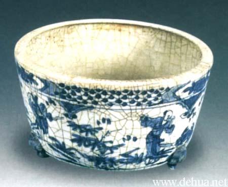 明代中晚期興起的青花瓷目前所見主要有瓶、爐等器物,其青花色澤淺淡,藍(lán)中泛灰黑或藍(lán)中微紫。紋飾主要是人物和花草。其裝飾技法是手繪,用筆草率,構(gòu)圖簡樸。所繪人物,衣裳多單薄,五官或模糊不清,如青花人物三足爐。是目前所見德化青花瓷中最完美的一件。