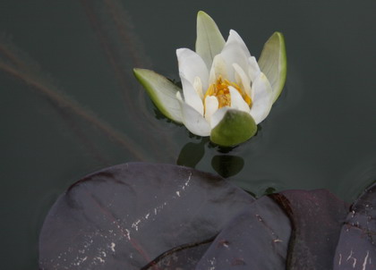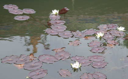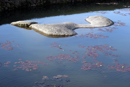 在石壺殿門殿門前半月池里,時值正午,正逢石牛山一寶、世間少有的午時蓮盛開,紫中泛綠的蓮葉,襯托著細巧的黃芯白花,倒映水中,鯉魚競翔追逐,激起波波漣漪。