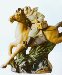 "文革"期間我國曾培訓了一批具有初級醫(yī)療技術的醫(yī)務人員,讓他們深入到農村去,送醫(yī)送藥到田頭,由于他們有病人時就看病,沒病人時就參加生產勞動,因此,當?shù)氐霓r民就把他們尊稱為"赤腳醫(yī)生","文革"期間石灣陶塑中也創(chuàng)作了不少反映這方面內容的作品,如潮安窯1972年制作的"銀針傳友誼塑像",軍醫(yī)為了傳授針灸技術,讓"赤腳醫(yī)生"在自己身上試針,表現(xiàn)了軍民魚水情的關系。又如黃松堅創(chuàng)作的彩釉"騎馬送醫(yī)"塑像,作品塑造了草原上的女赤腳醫(yī)生身背藥箱,頭圍淺色圍巾,身穿淡青色蒙古袍,腳穿皮靴,騎馬飛馳在草原上的情景。形象極富時代化,格調秀雅脫俗。