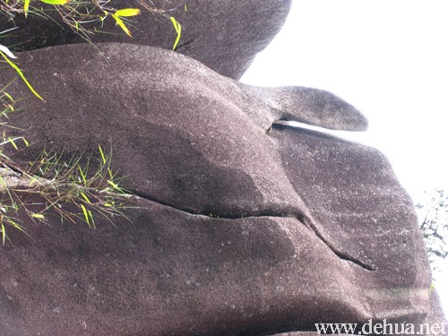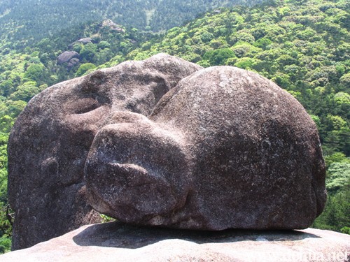 到了彌勒殿,碰到二十年前的一名學(xué)生。學(xué)生在九仙山由政府聘請當(dāng)了十多年的護(hù)山人,對九仙山的一草一木了如家珍。帶我們細(xì)看元代至元年間的戴冠觀音石刻造像。 觀音,又稱“觀世音”、“觀自在”,為佛教大乘菩薩之一,通常與大勢至菩薩、阿彌陀佛并重,合稱“西方三圣”。佛經(jīng)傳說,此佛慈悲為懷,法和無邊,廣化眾生,善于諸般變化,故有水月、白衣、坐獅、立磐、合掌、多面、渡海、千手、立蓮等各種形象。 由于自然造化,引來了許多觀覽者駐足流連。這一神奇的石雕景觀,其頭冠、面孔、肩臂、軀干等清晰輪廓,與民間流傳的觀音特征極為相似。最神奇的是,該觀音造像手腳部分從不同角度可以看出男、女不同形態(tài),與傳說中的觀音由男變女的故事不謀而合。 山上有宋代修建的仙峰巖(現(xiàn)改修為廣欽寺)和普陀巖遺址及43處歷代摩崖石刻。