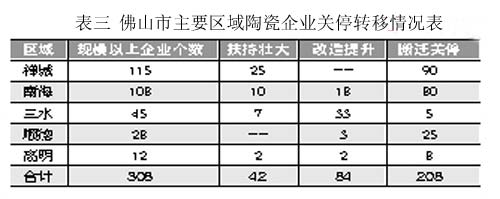 表三是佛山市各區(qū)域陶瓷企業(yè)關(guān)停轉(zhuǎn)移的情況介紹,屬于扶持壯大的只有42家,關(guān)停并轉(zhuǎn)的有208家,占2007年企業(yè)總數(shù)量的三分之二。各區(qū)還制定了時間表,如規(guī)模篇里的表一所示,最遲在2010年全部完成改造提升。